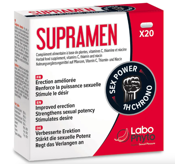 Supramen est un complément alimentaire développé par Labophyto, un laboratoire français assez omniprésent dans les rayons « sexualité » des parapharmacies. Contrairement aux petits nouveaux qui ne se vendent que sur le web, vous avez probablement déjà croisé cette boîte noire.